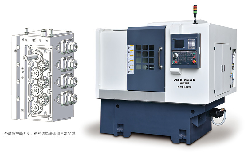 八工位(侧向四工位+端向四工位)静音强力型动力头, 可在端面或侧面进行钻、铣、攻、雕等复杂加工,亦可运行五轴联动的复杂加工程式,Y轴轨道采用线性导轨结构, 电机与丝杆经直连组合, 其精度高, 换刀速度快。